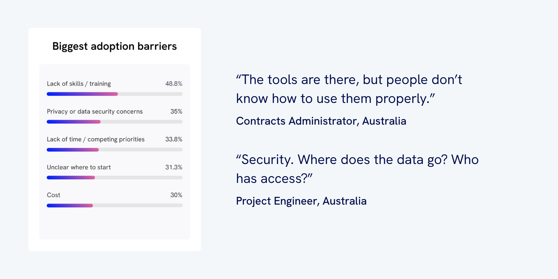What it means: Interest is high, but consistent, embedded usage is still developing. There’s significant opportunity as more construction-specific AI solutions emerge and teams grow in confidence.